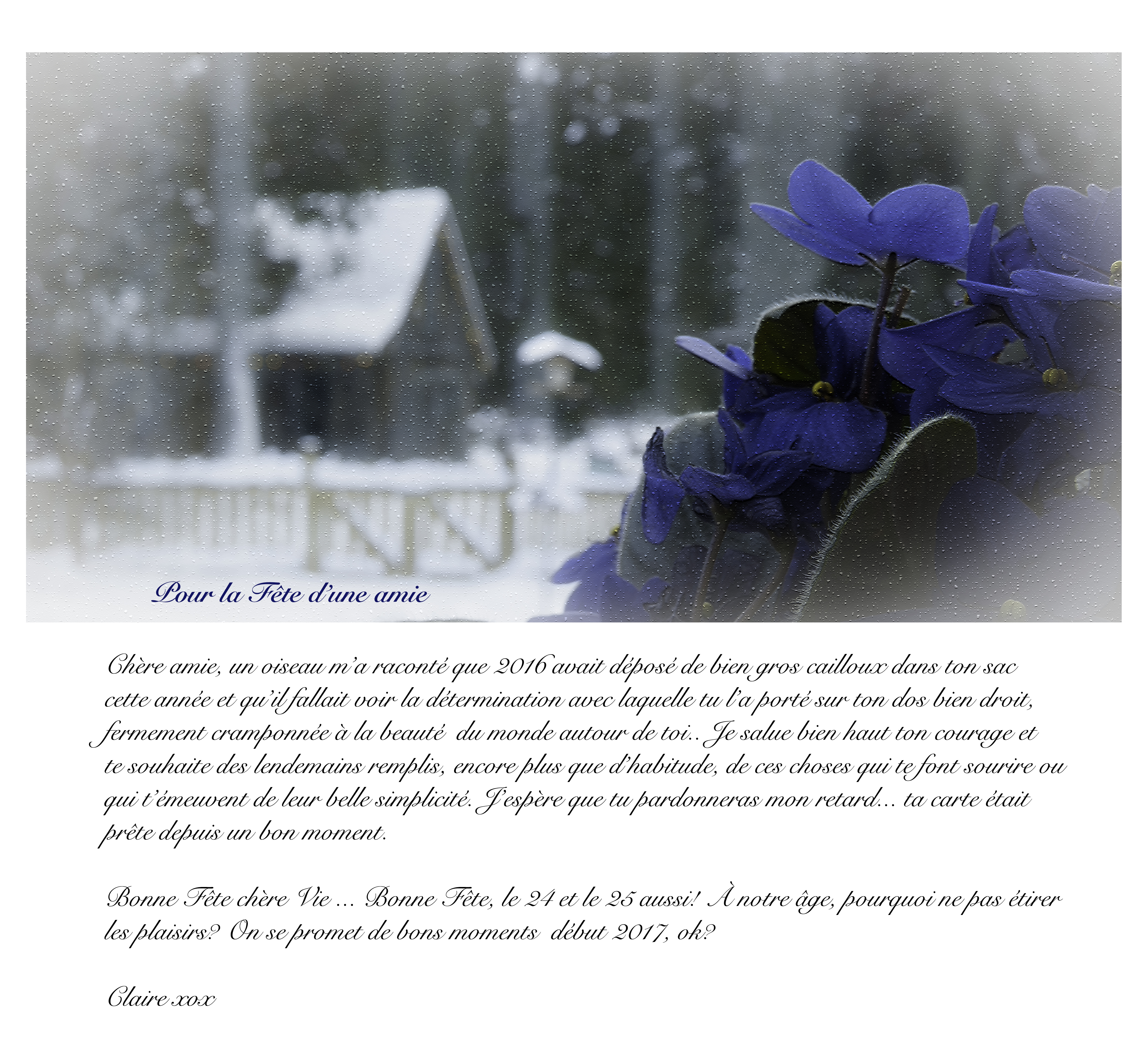 Tes mots me touchent à un point que tu ne peux pas imaginer. Tes yeux voient la beauté qui m’émerveille et ton coeur connaît les sentiments qui m’habitent. Tu es d’une grande sensibilité Clara et je me sens privilégiée de t’avoir comme amie.
