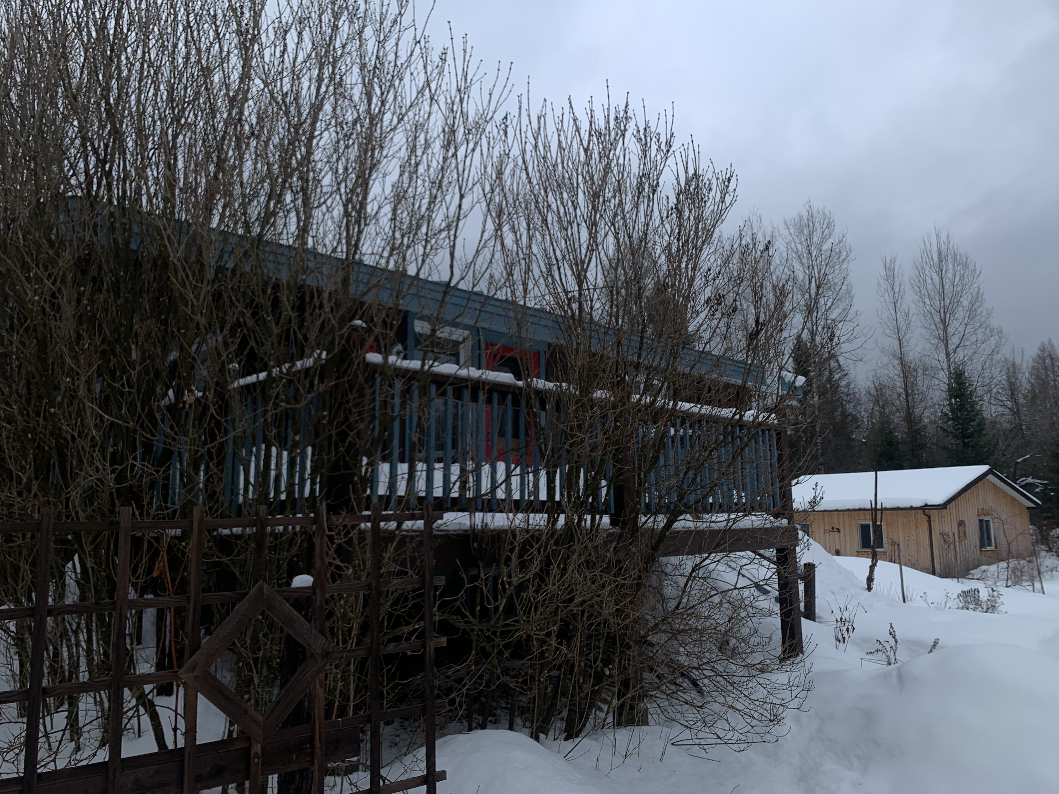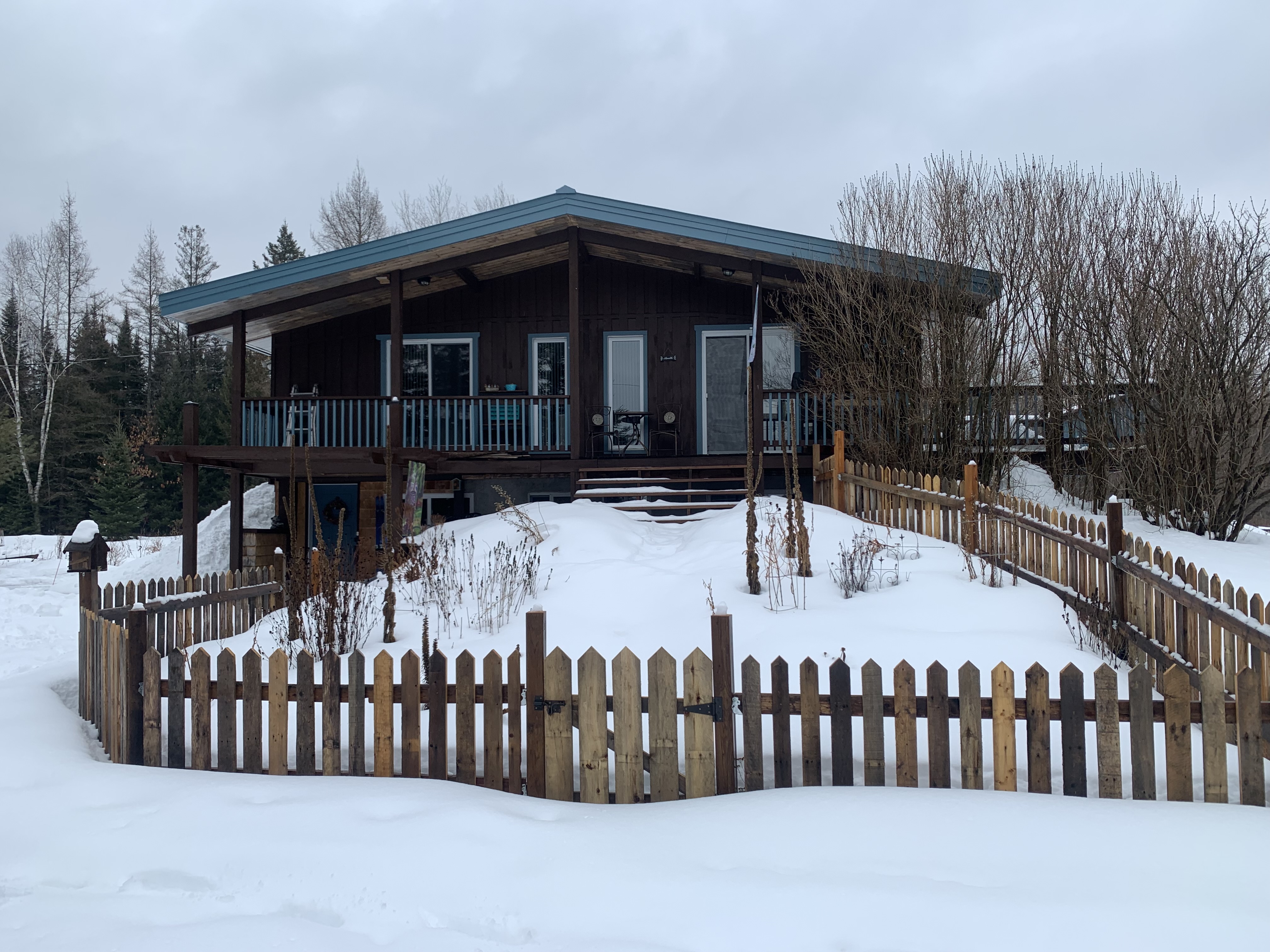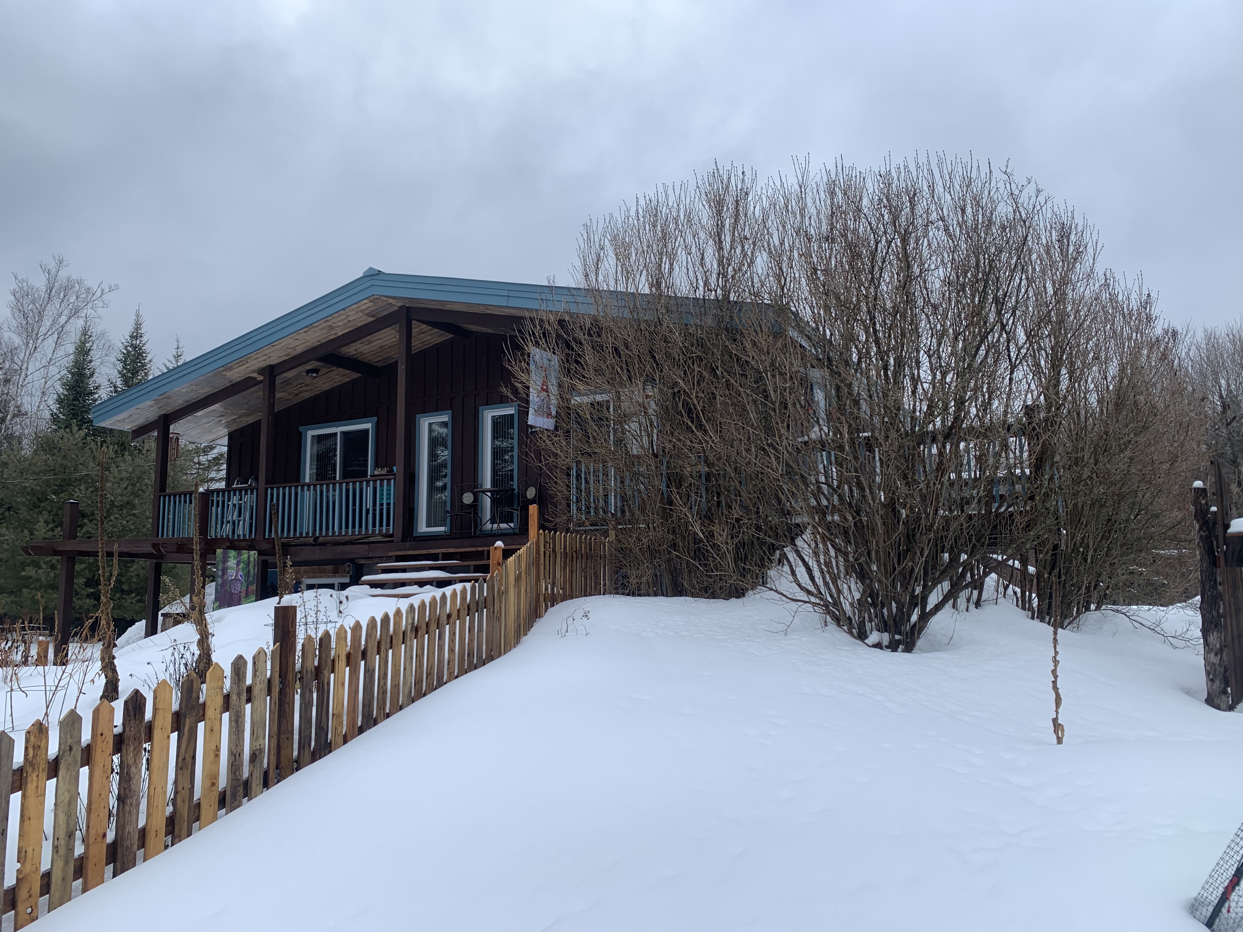 - solarium avec toit cathédrale sur pieux et isolé avec toit en métal bleu en continu avec le toit existant